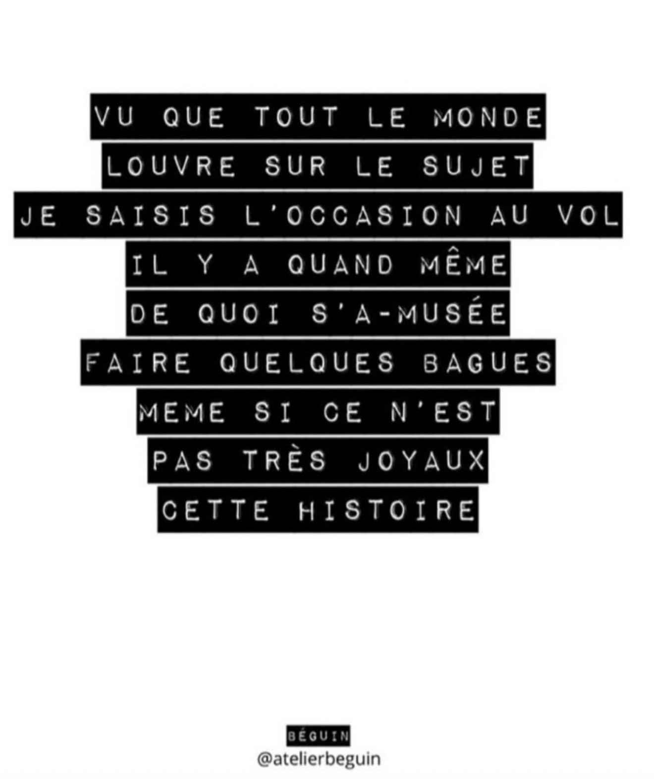Dans le cas, bien récent du vol des bijoux du Louvre, au-delà de la tragédie que cela représente, on voit combien chacun absorbe la réalité de cette mauvaise nouvelle avec de l’humour, du panache, de l’intelligence et de la création. Et lorsque les français acceptent de décaler la réalité avec humour, ils acceptent sans soucis que d’autres le fassent, partout dans le monde.